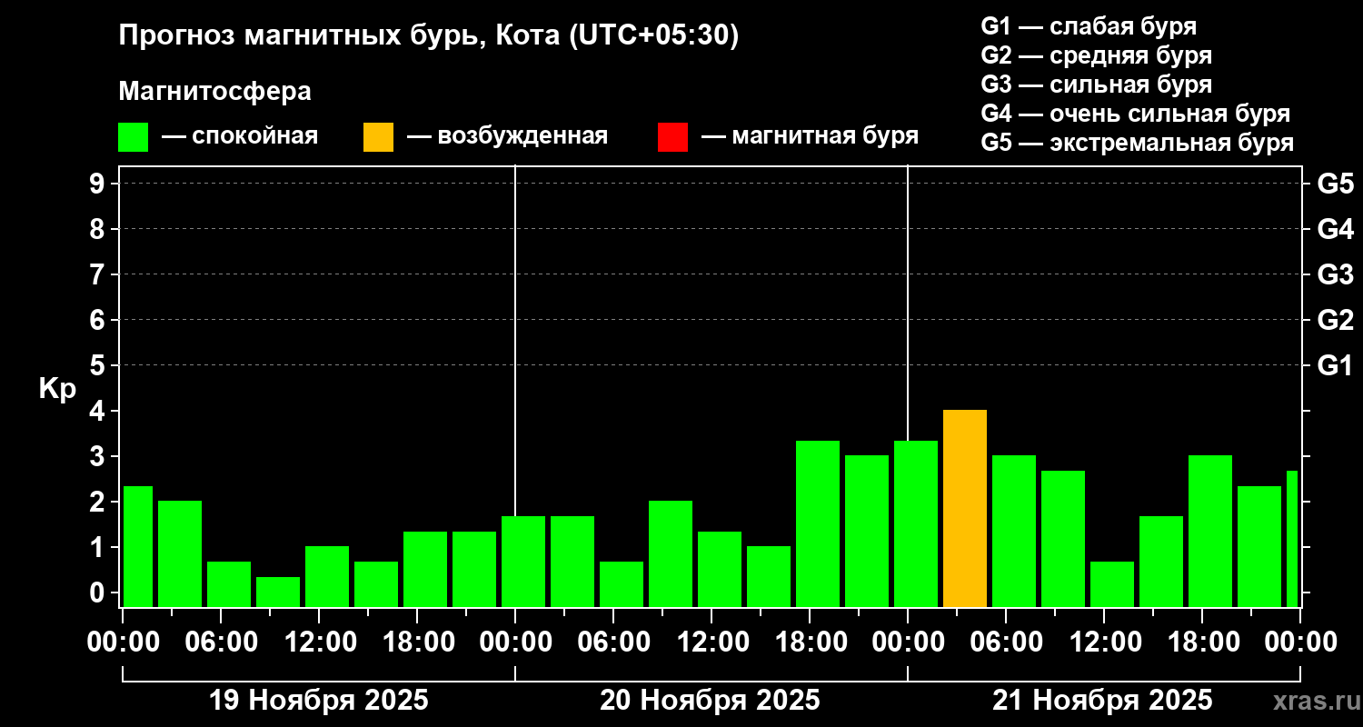 Прогноз магнитных бурь в Коте на 19 ноября 2025 года