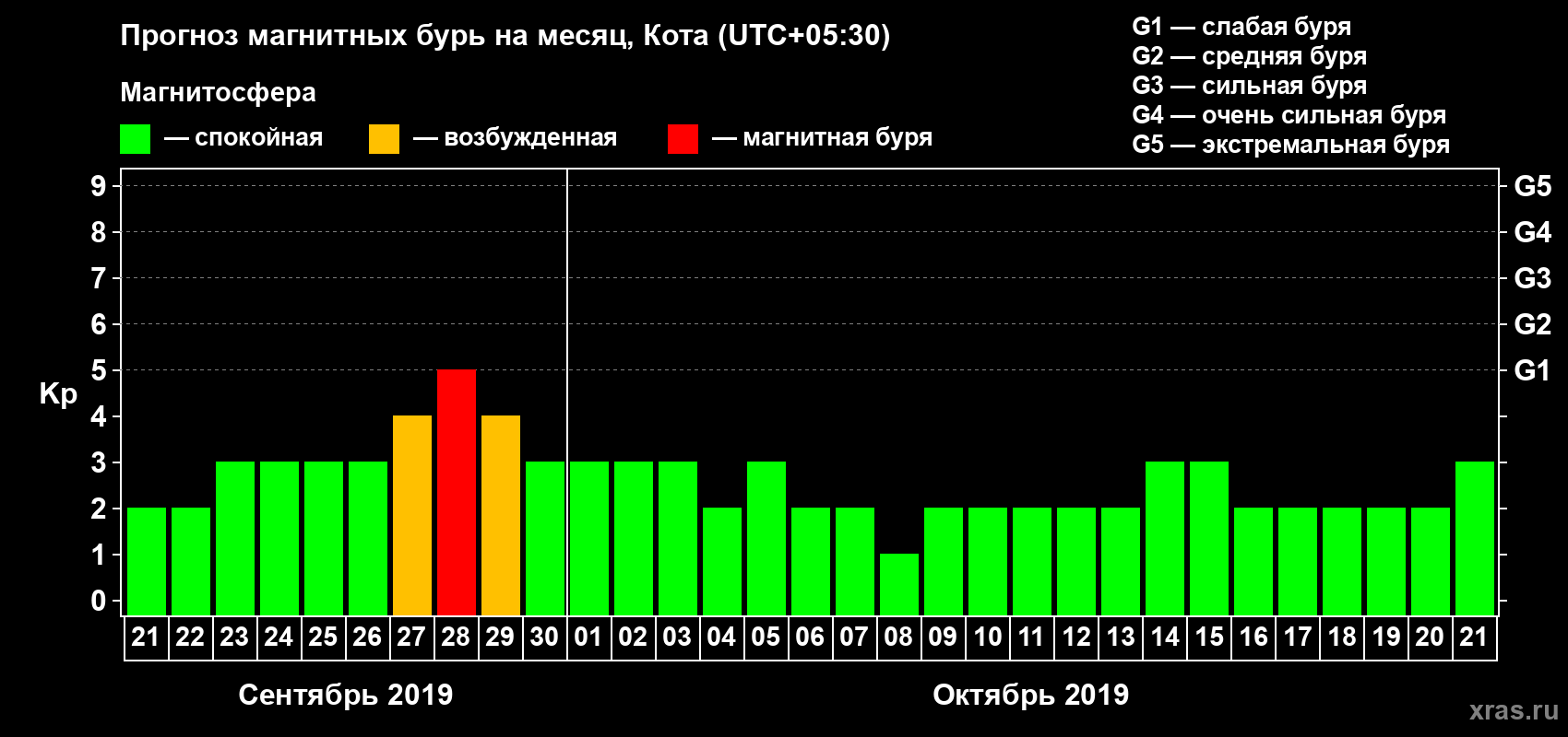 Прогноз магнитных бурь в Коте — 21 сентября 2019 года