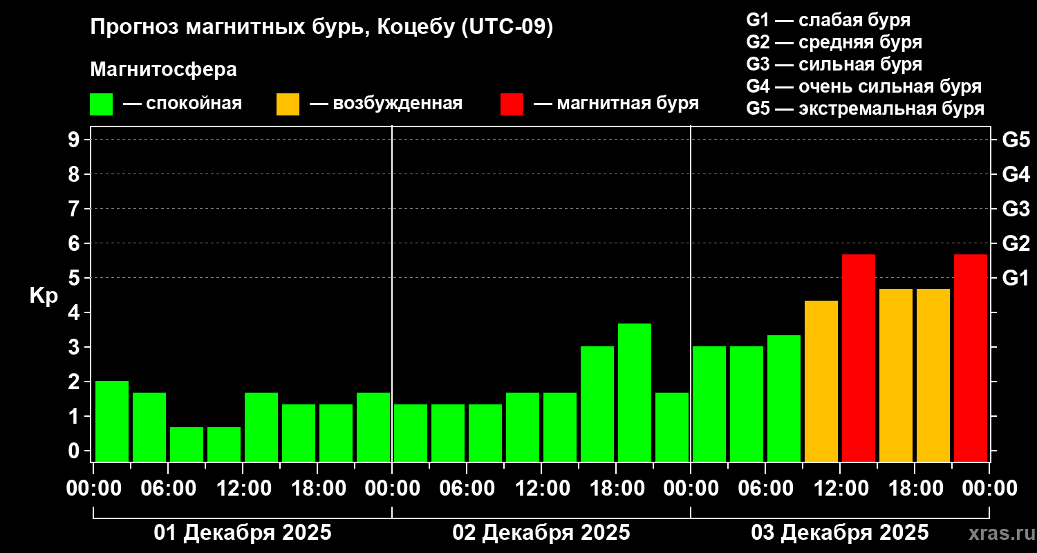 Прогноз магнитных бурь Коцебу — 1 декабря 2025 года