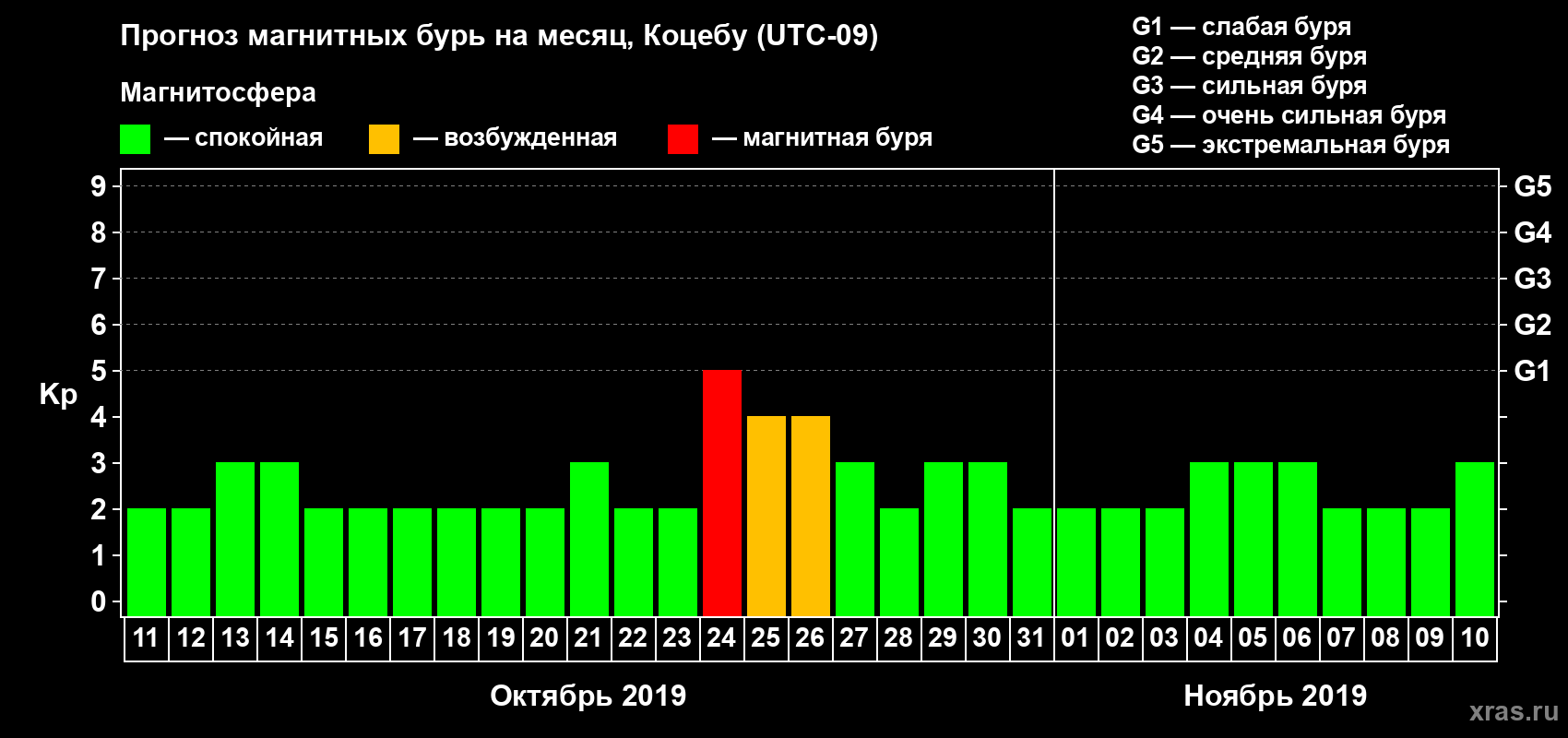 Прогноз магнитных бурь Коцебу — 11 октября 2019 года