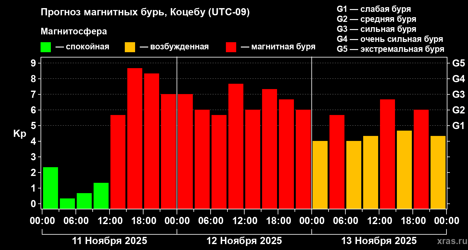 Прогноз магнитных бурь Коцебу — 11 ноября 2025 года