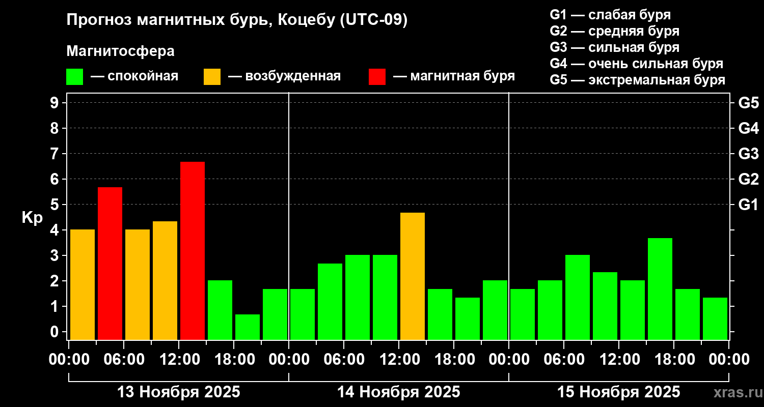 Прогноз магнитных бурь Коцебу на 13 ноября 2025 года