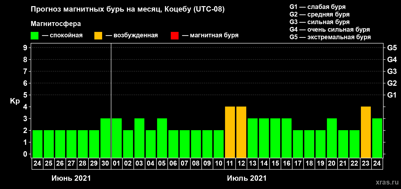 Прогноз магнитных бурь Коцебу — 24 июня 2021 года