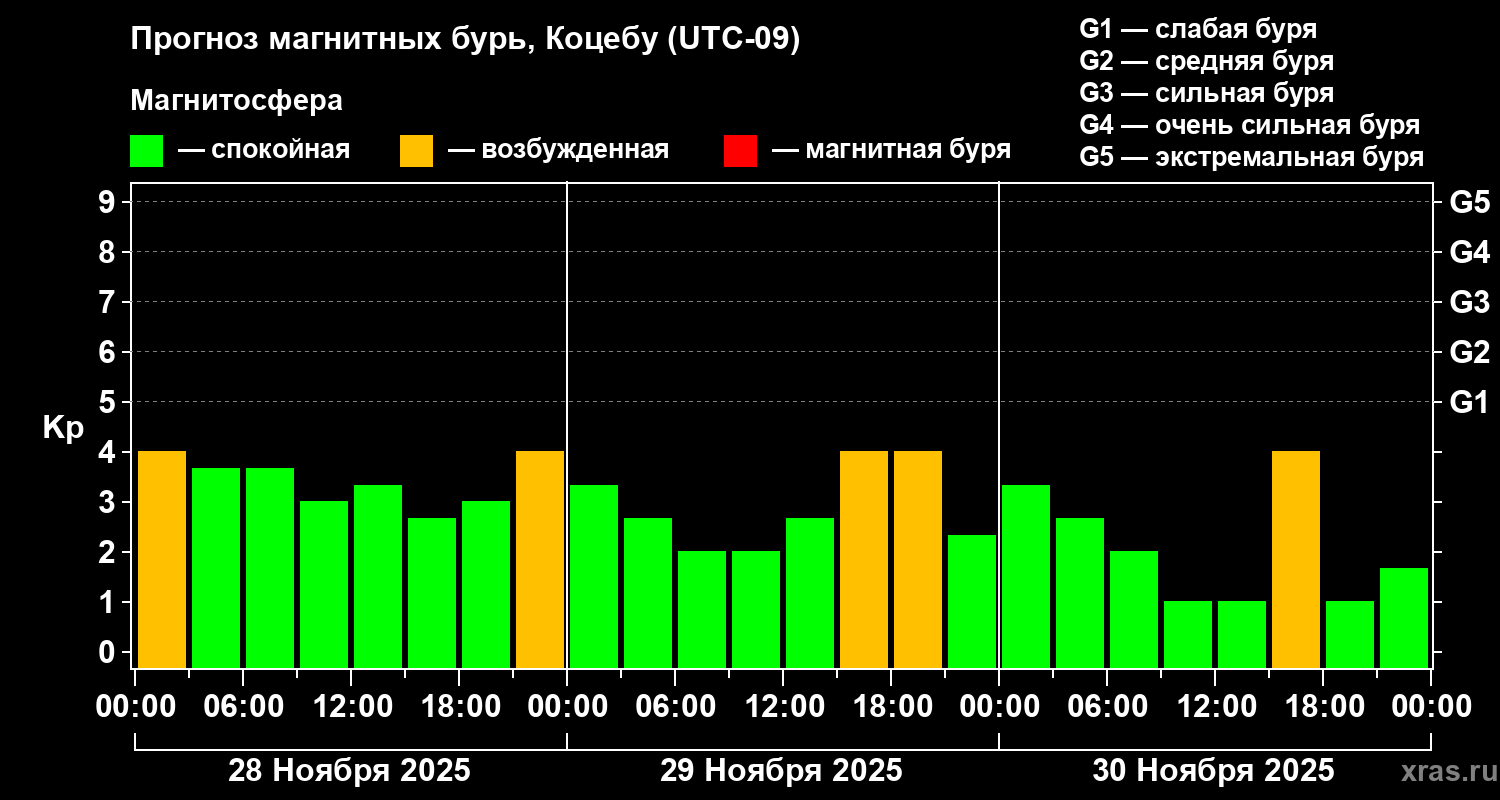 Прогноз магнитных бурь Коцебу — 28 ноября 2025 года