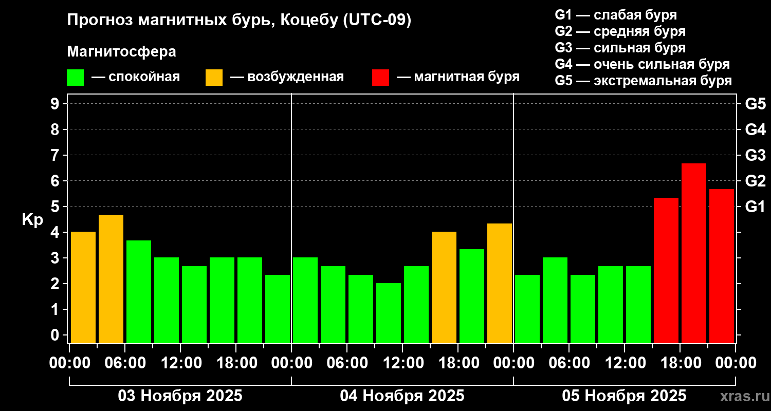 Прогноз магнитных бурь Коцебу — 3 ноября 2025 года