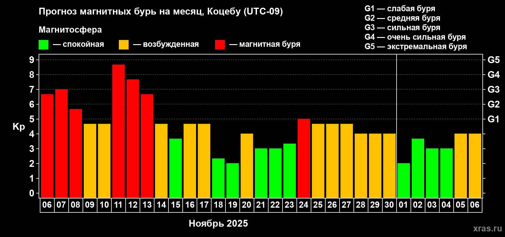 Прогноз магнитных бурь Коцебу — 6 ноября 2025 года