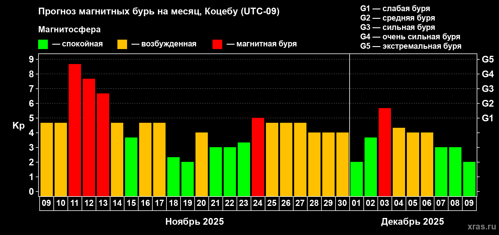 Прогноз магнитных бурь Коцебу — 9 ноября 2025 года