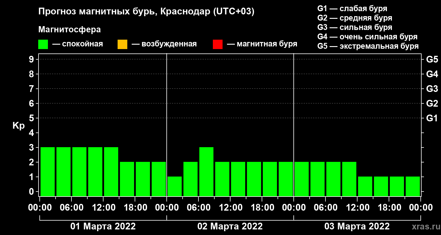 Вероятность спокойной обстановки (зеленый), возмущенной (желтый) и магнитных бурь (красный) на 03.03.2022