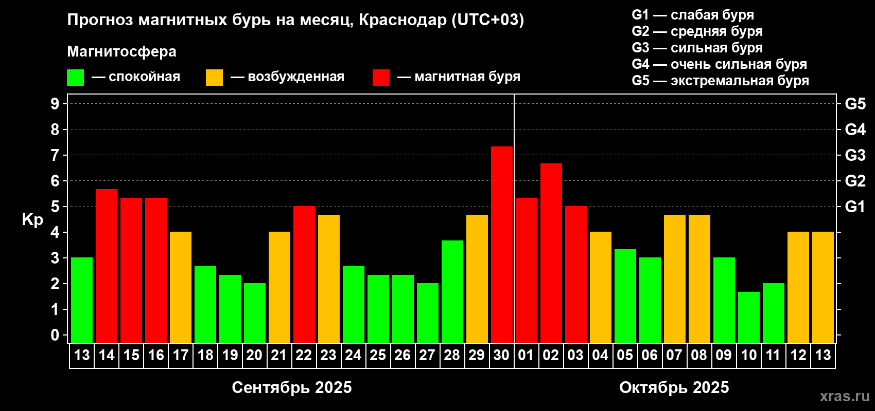 Прогноз магнитных бурь в Краснодаре — 13 сентября 2025 года