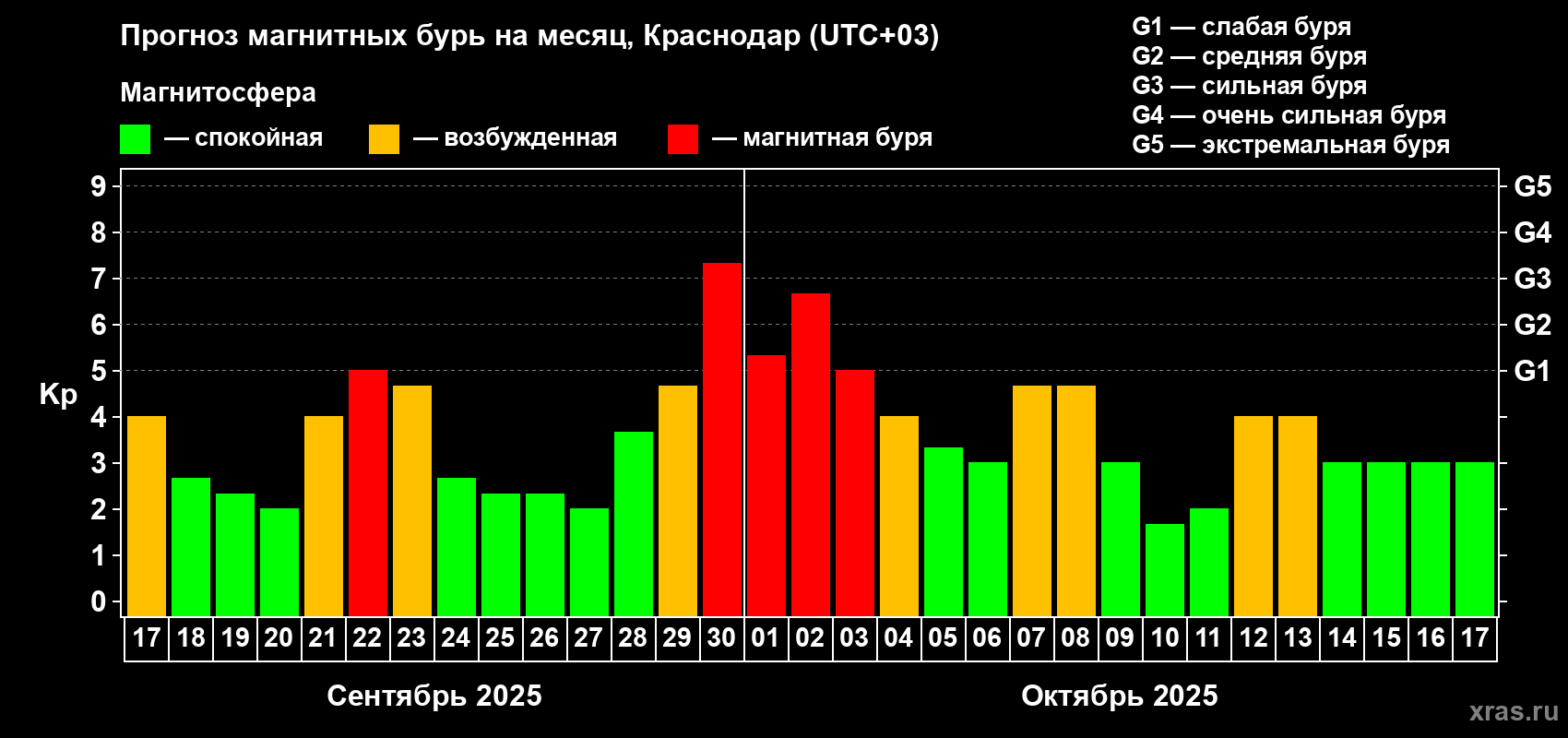 Прогноз магнитных бурь в Краснодаре — 17 сентября 2025 года