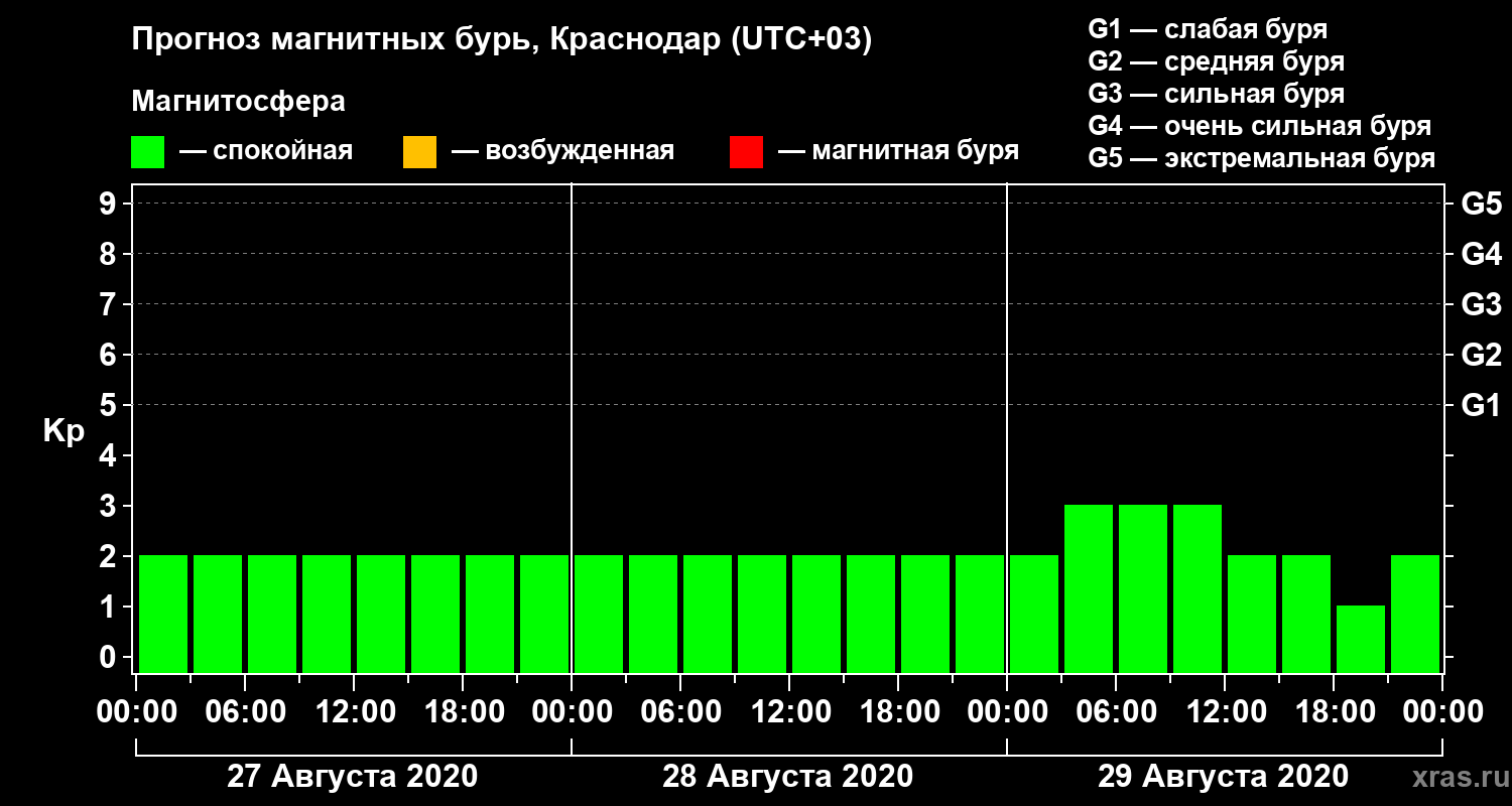 Прогноз магнитных бурь в Краснодаре на 27 августа 2020 года