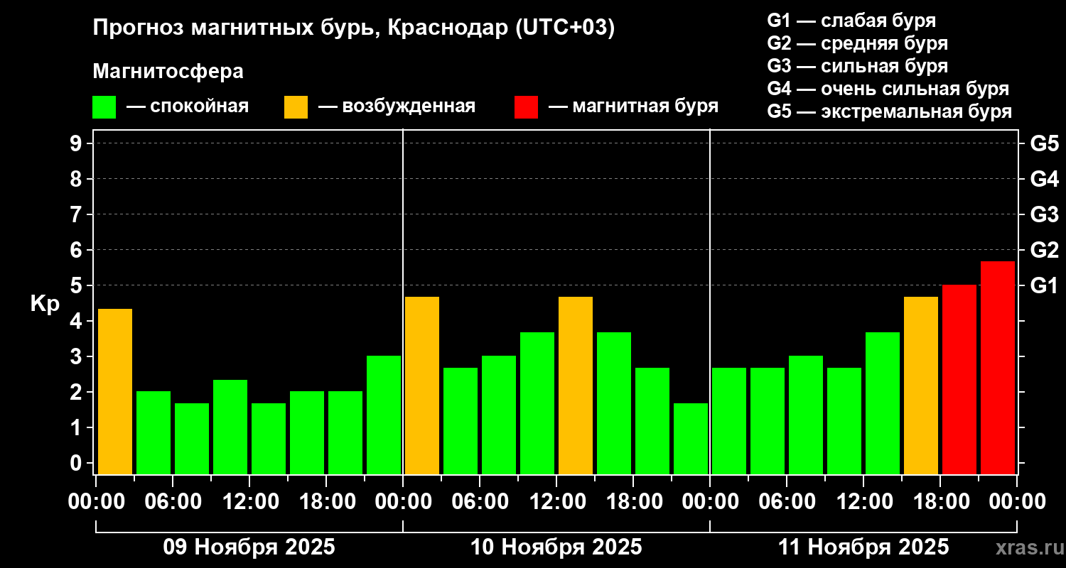 Прогноз магнитных бурь в Краснодаре — 9 ноября 2025 года