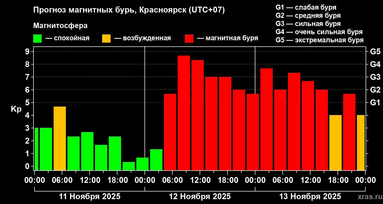 Прогноз магнитных бурь в Красноярске — 11 ноября 2025 года