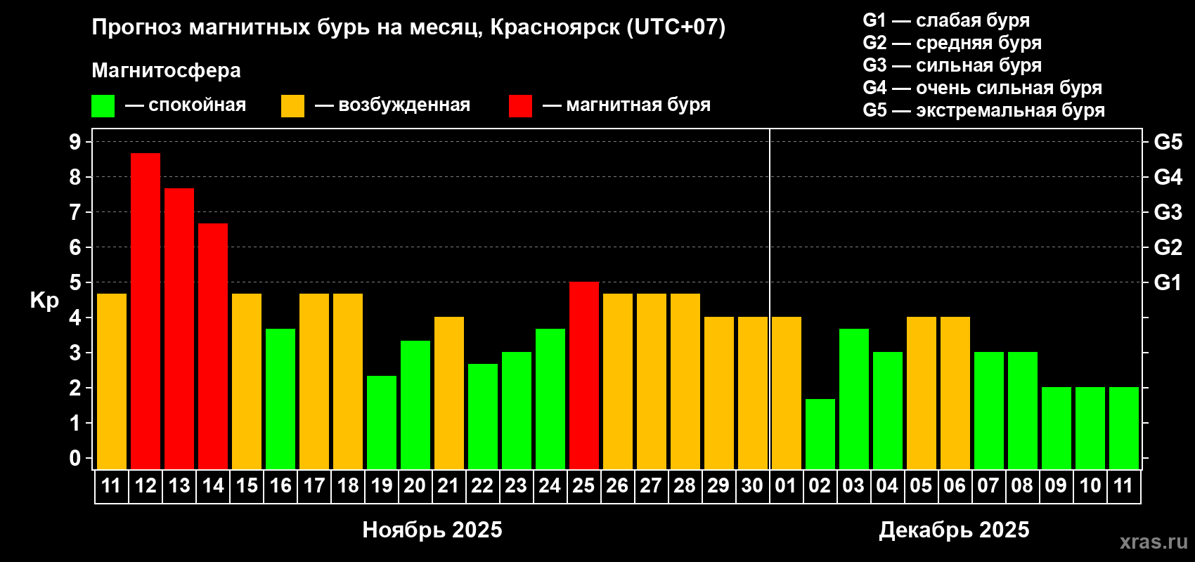 Прогноз магнитных бурь в Красноярске на 11 ноября 2025 года
