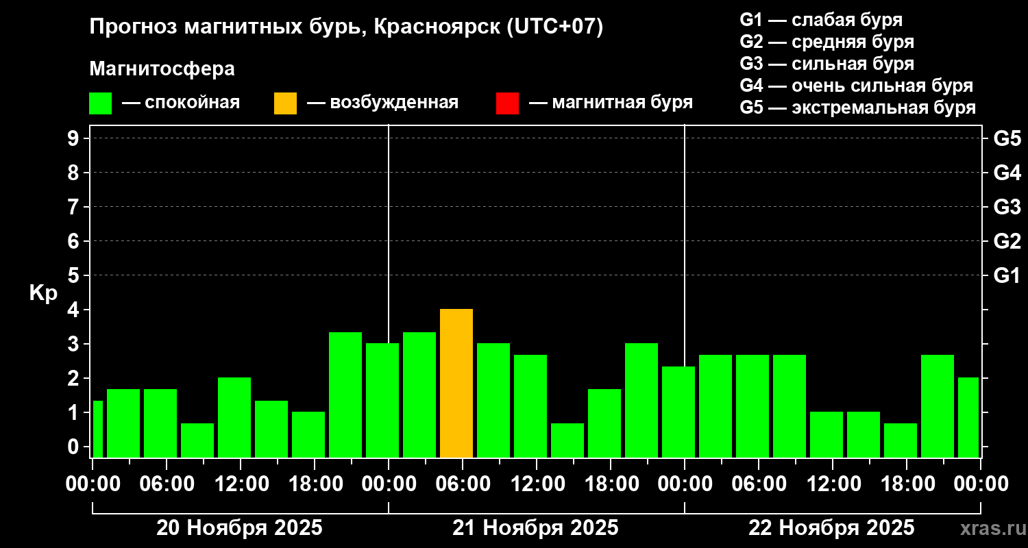 Прогноз магнитных бурь в Красноярске на 20 ноября 2025 года