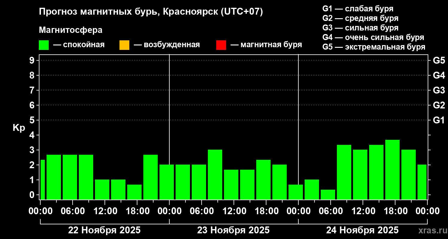 Прогноз магнитных бурь в Красноярске — 22 ноября 2025 года
