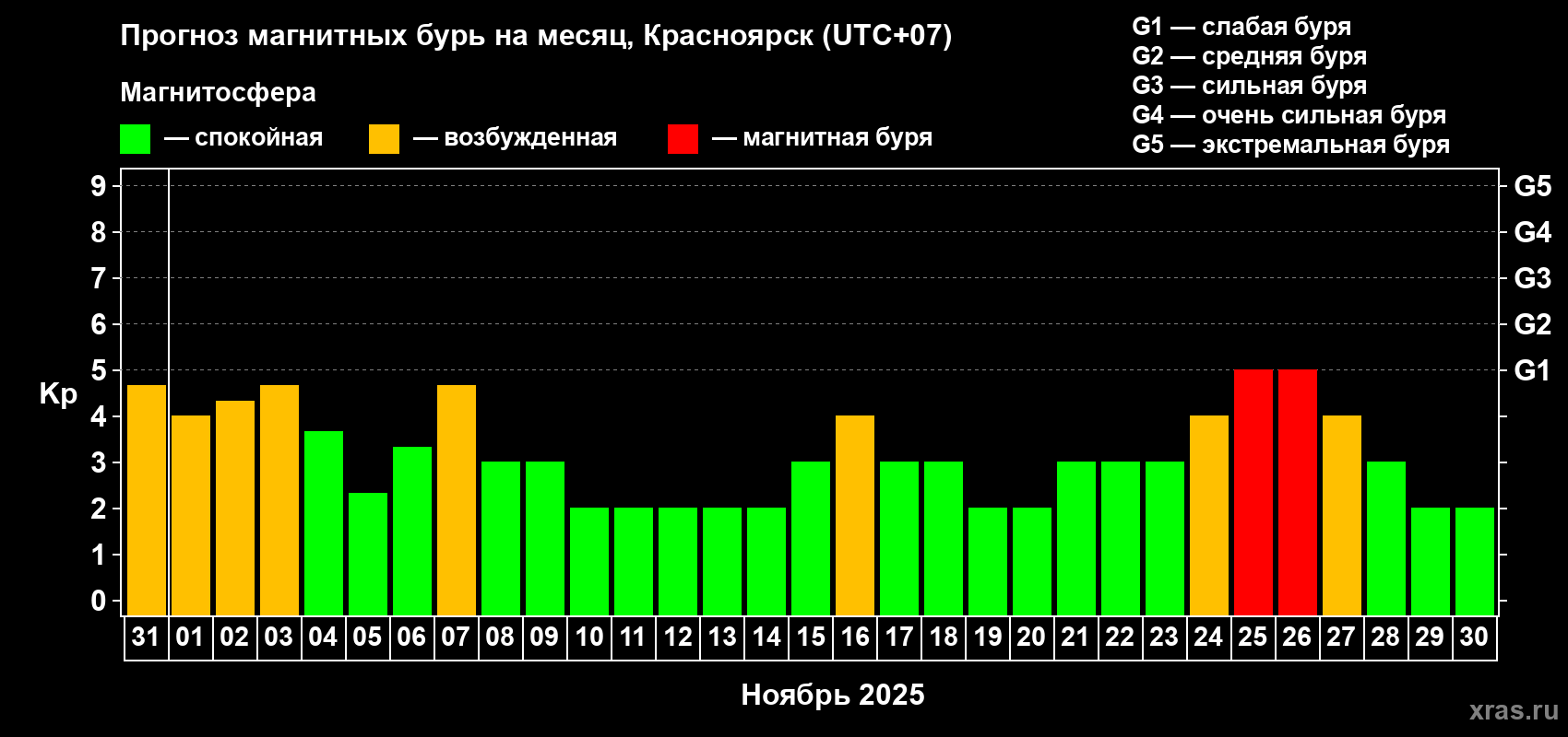 Прогноз магнитных бурь в Красноярске — 31 октября 2025 года