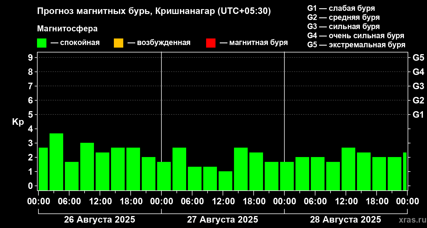 Прогноз магнитных бурь в Кришнанагаре — 26 августа 2025 года