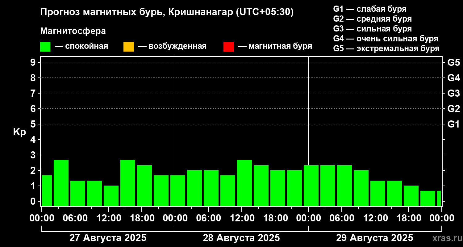 Прогноз магнитных бурь в Кришнанагаре — 27 августа 2025 года
