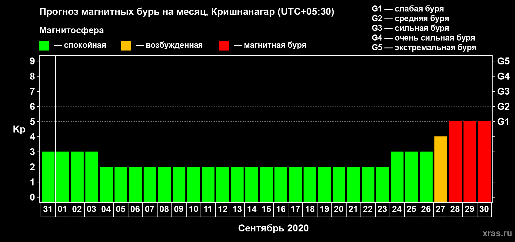 Прогноз магнитных бурь в Кришнанагаре — 31 августа 2020 года