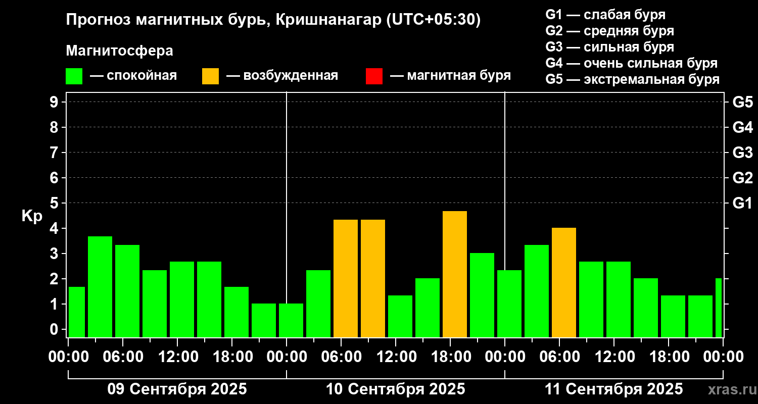 Прогноз магнитных бурь в Кришнанагаре — 9 сентября 2025 года