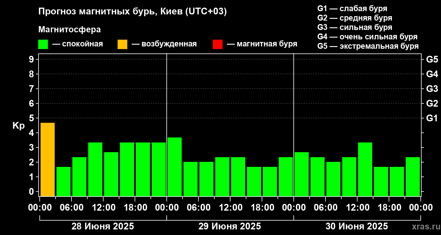 Прогноз магнитных бурь в Киеве — 28 июня 2025 года