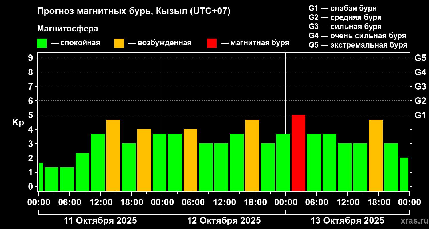Прогноз магнитных бурь в Кызыле на 11 октября 2025 года