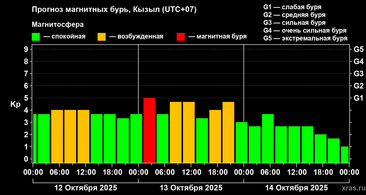 Прогноз магнитных бурь в Кызыле — 12 октября 2025 года