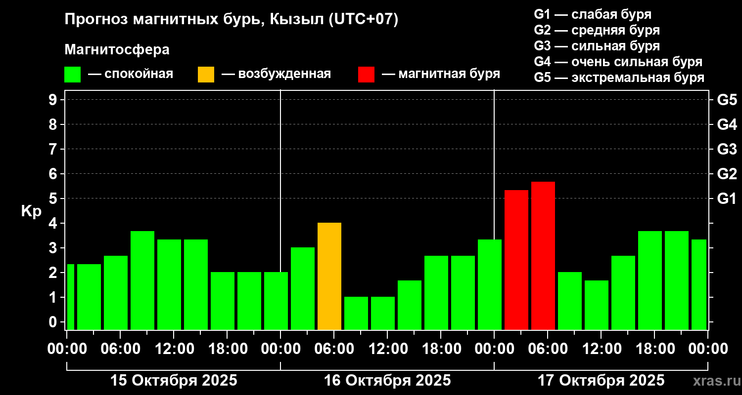 Прогноз магнитных бурь в Кызыле на 15 октября 2025 года