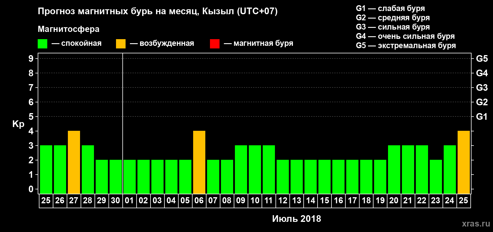 Прогноз магнитных бурь в Кызыле на 25 июня 2018 года