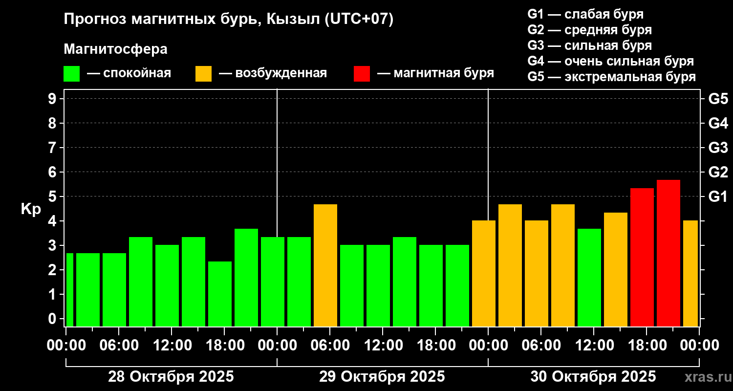 Прогноз магнитных бурь в Кызыле на 28 октября 2025 года