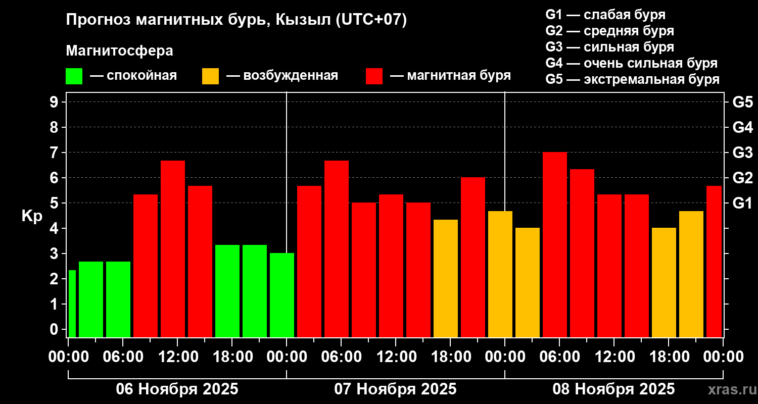Прогноз магнитных бурь в Кызыле на 6 ноября 2025 года