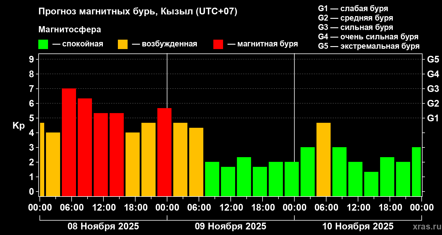 Прогноз магнитных бурь в Кызыле на 8 ноября 2025 года
