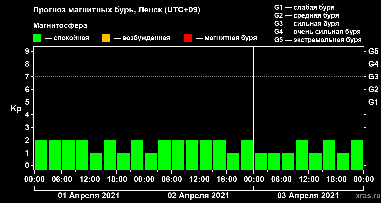 Прогноз магнитных бурь в Ленске на 1 апреля 2021 года