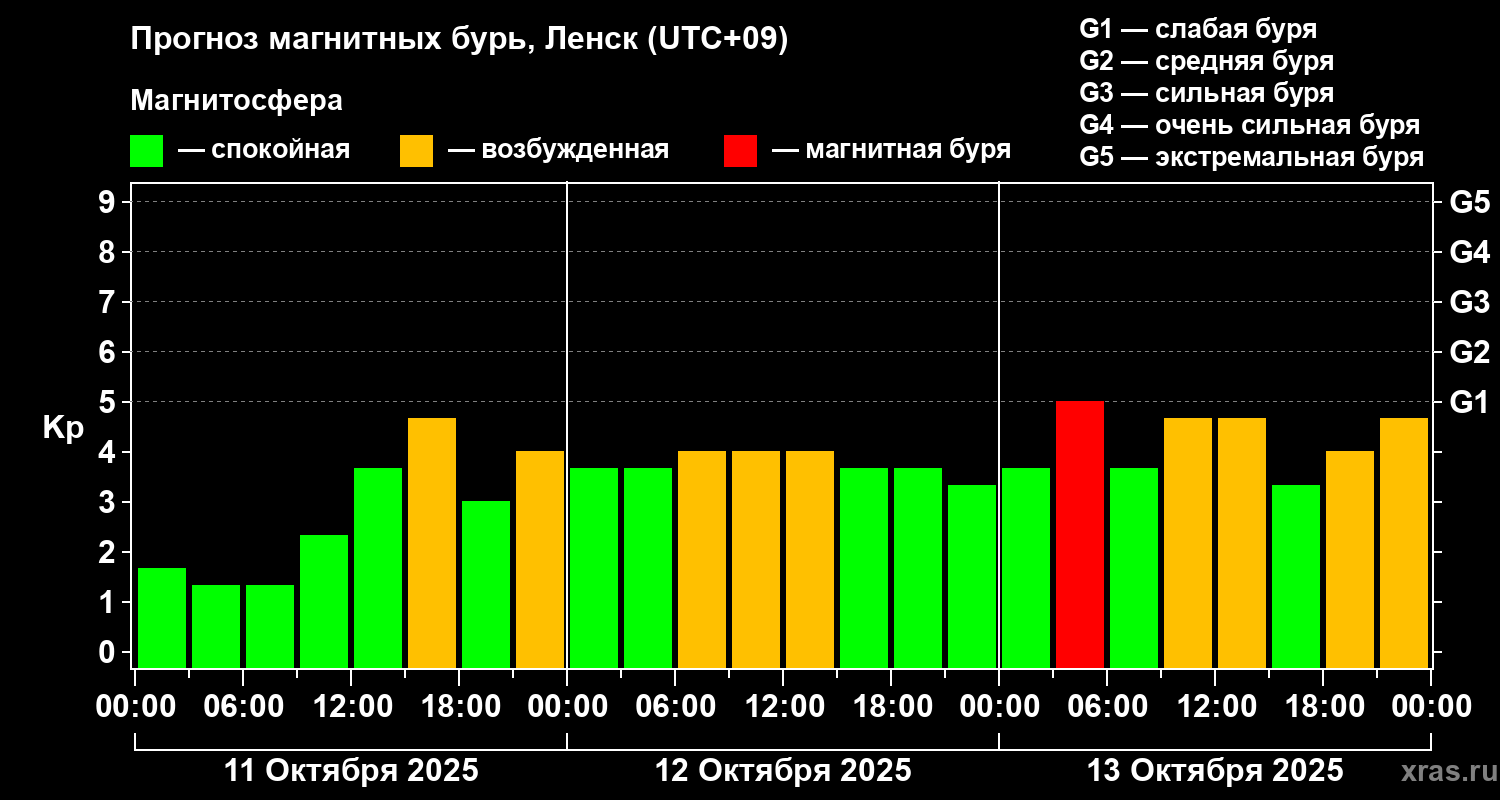Прогноз магнитных бурь в Ленске — 11 октября 2025 года