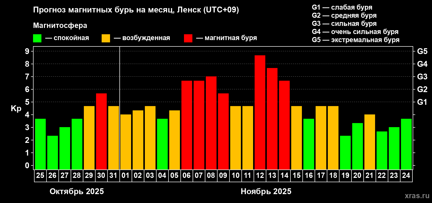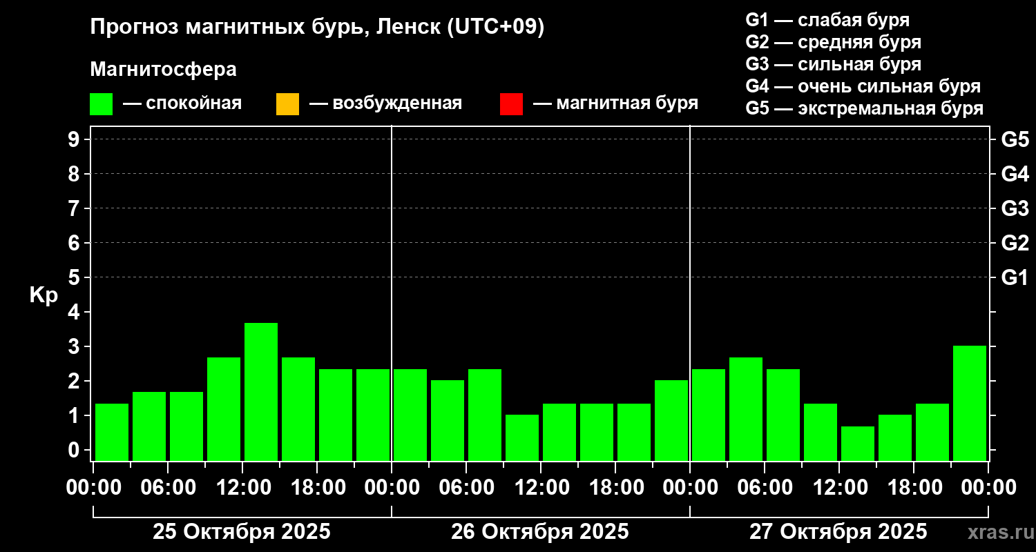 Прогноз магнитных бурь в Ленске — 25 октября 2025 года