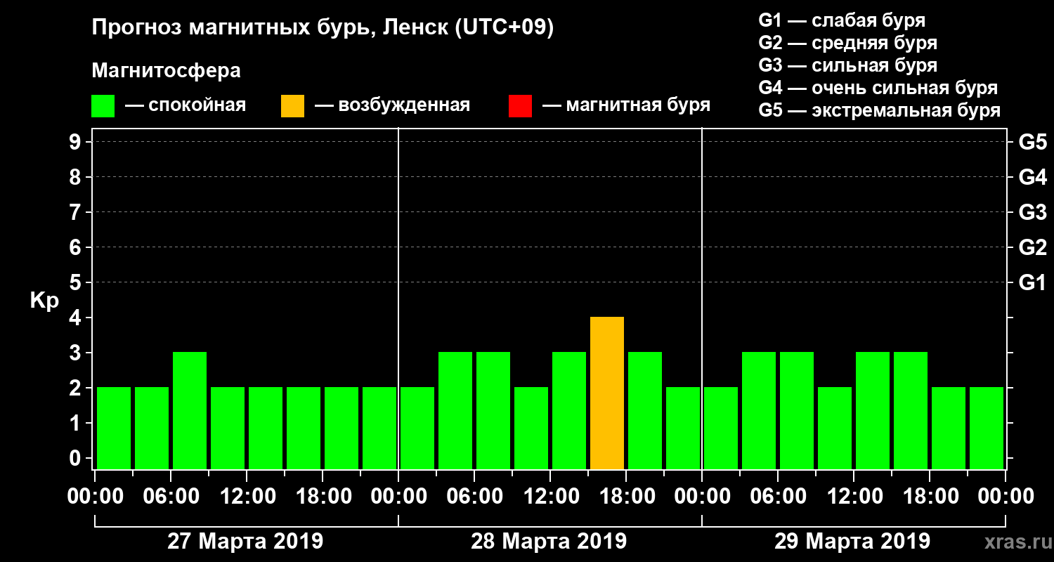 Прогноз магнитных бурь в Ленске на 27 марта 2019 года