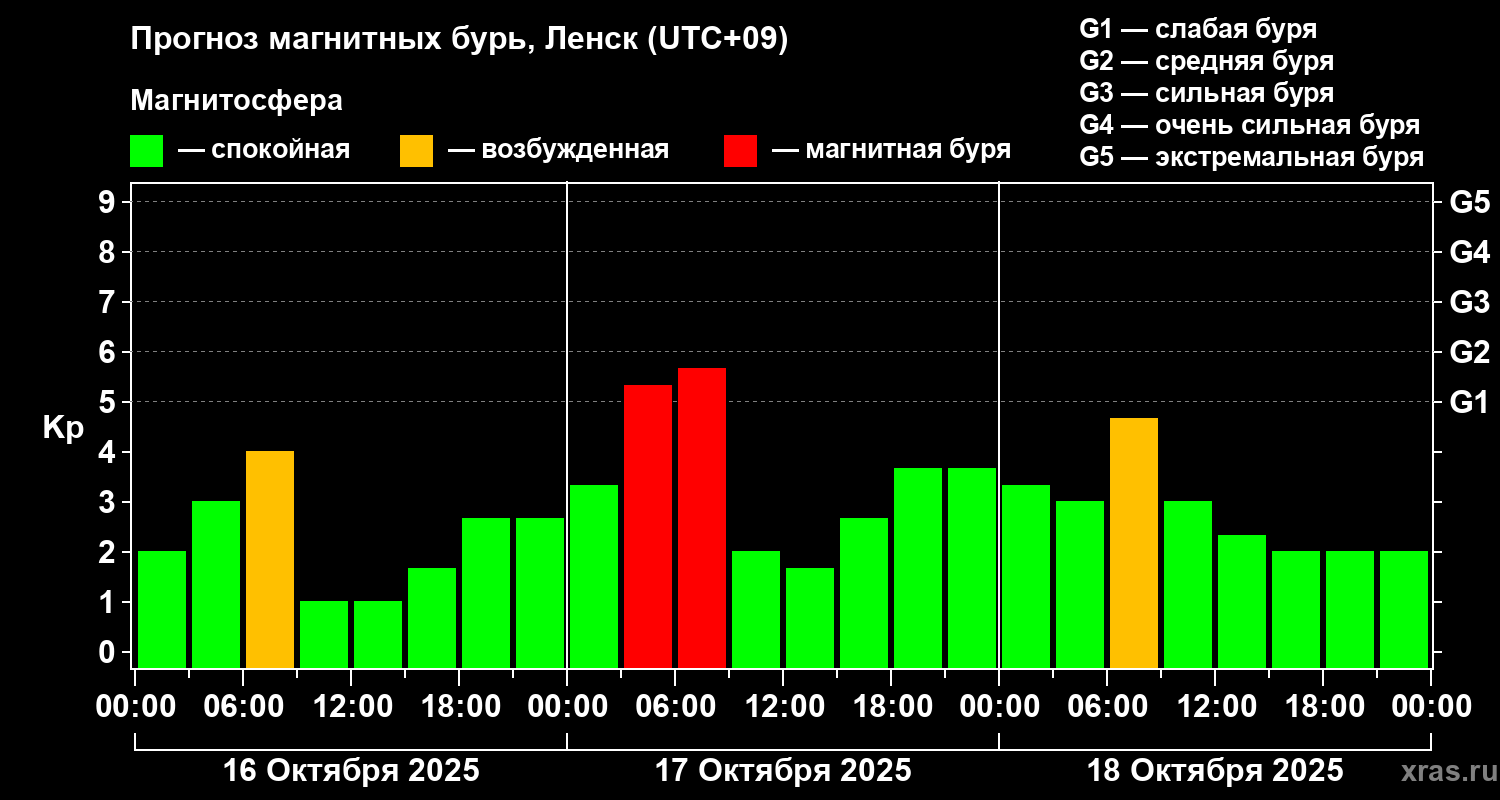 Прогноз магнитных бурь в Ленске — 16 октября 2025 года