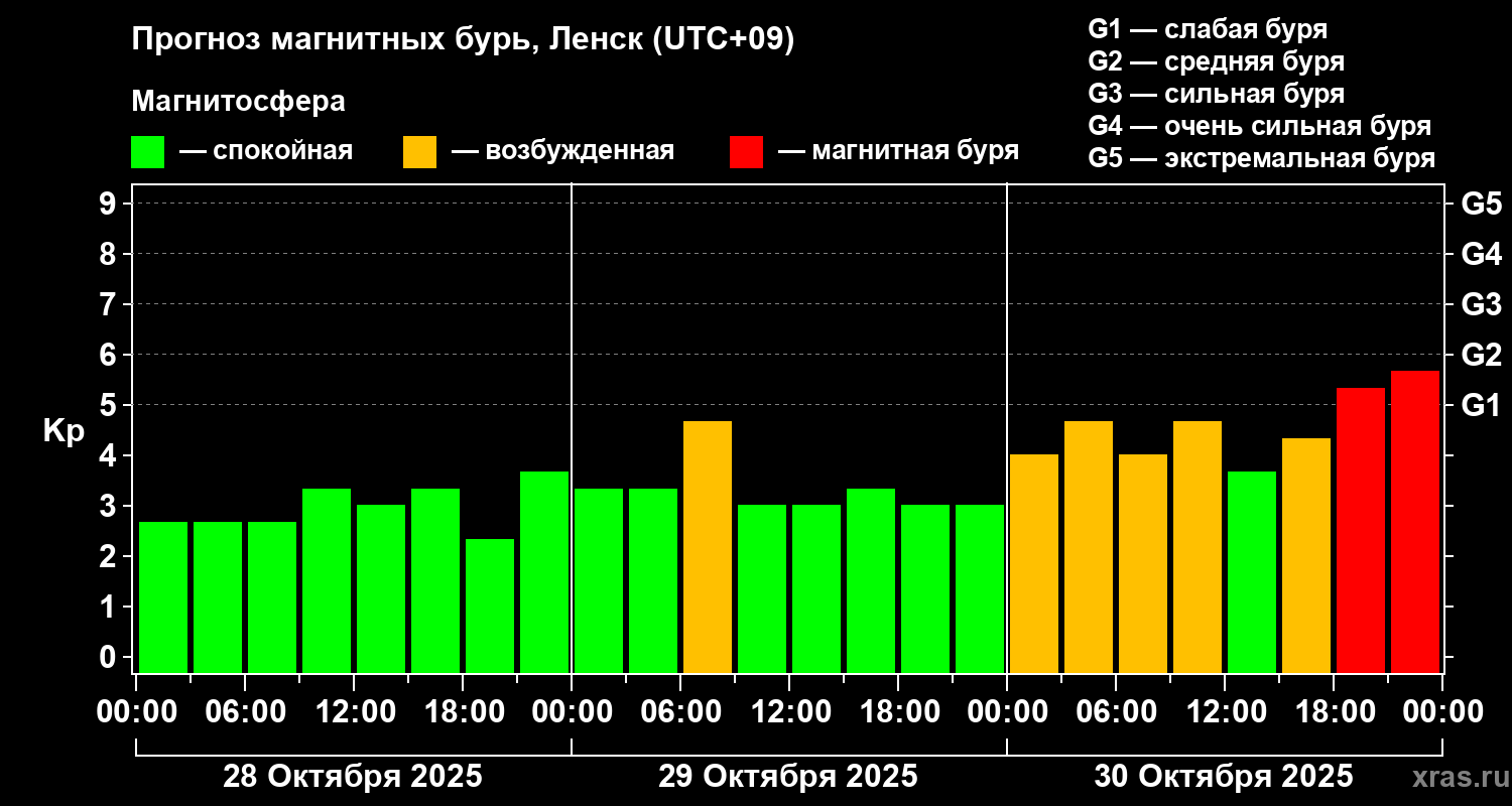 Прогноз магнитных бурь в Ленске — 28 октября 2025 года