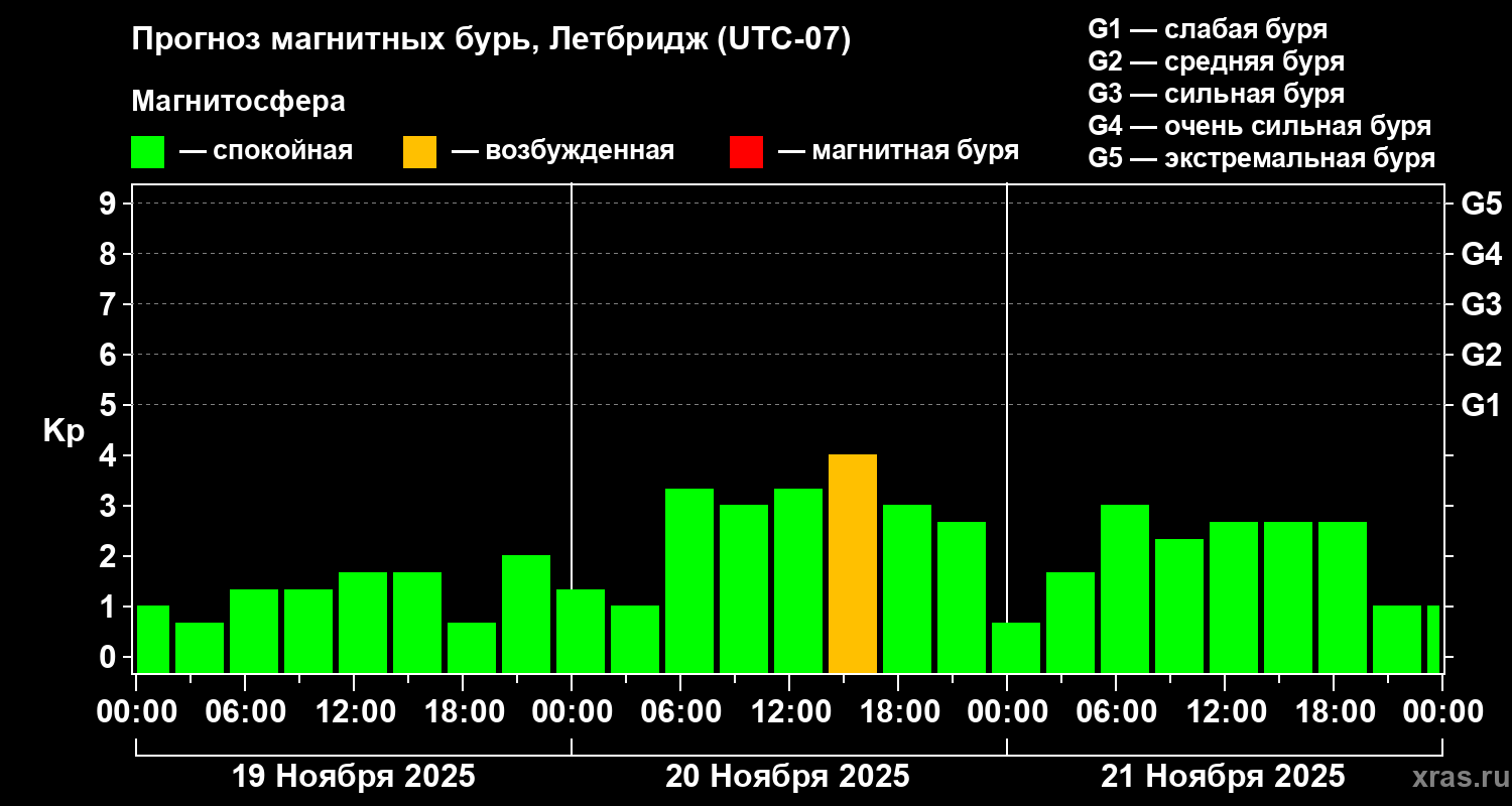 Прогноз магнитных бурь в Летбридже — 19 ноября 2025 года