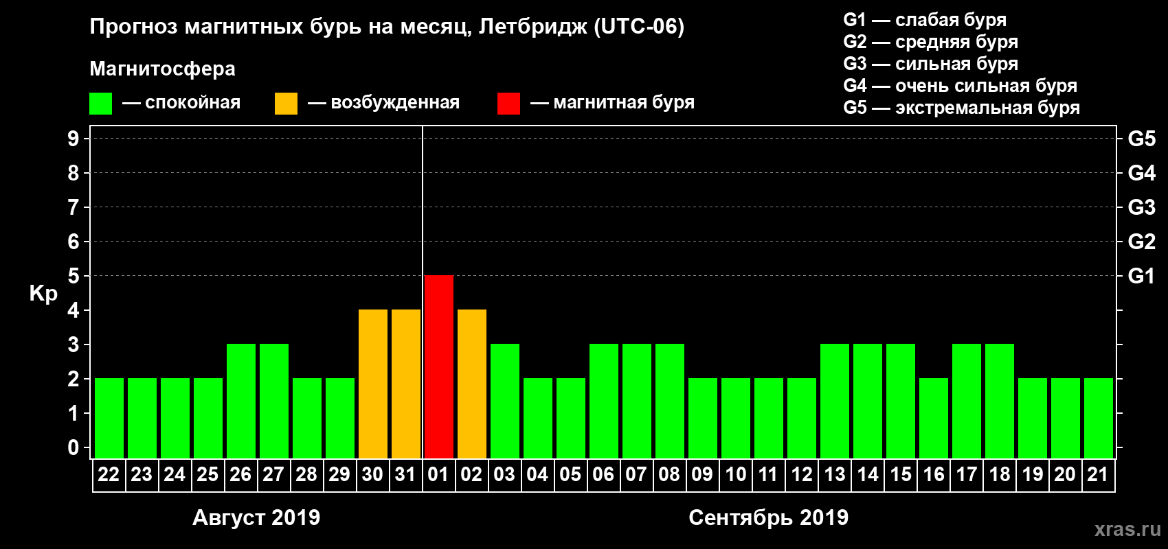 Прогноз магнитных бурь в Летбридже — 22 августа 2019 года