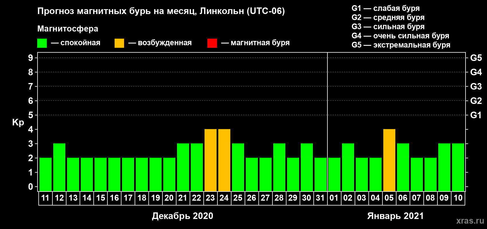 Прогноз магнитных бурь в Линкольне на 11 декабря 2020 года