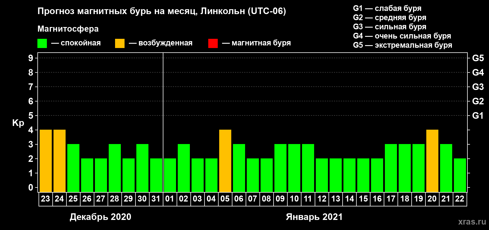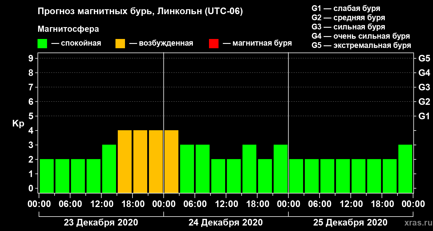 Прогноз магнитных бурь в Линкольне на 23 декабря 2020 года