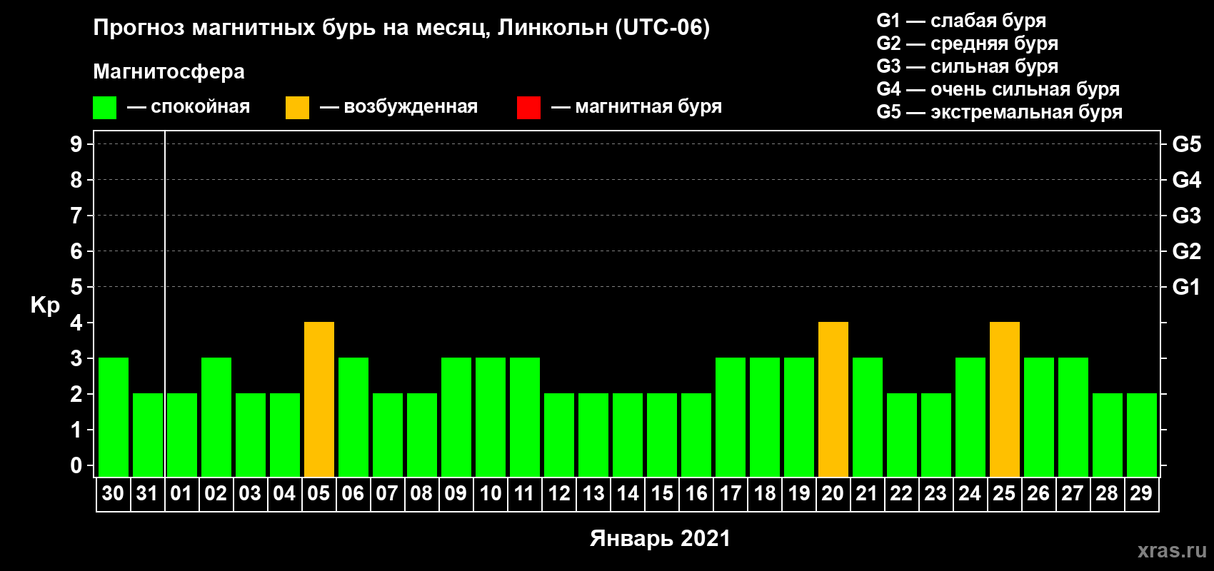 Прогноз магнитных бурь в Линкольне на 30 декабря 2020 года