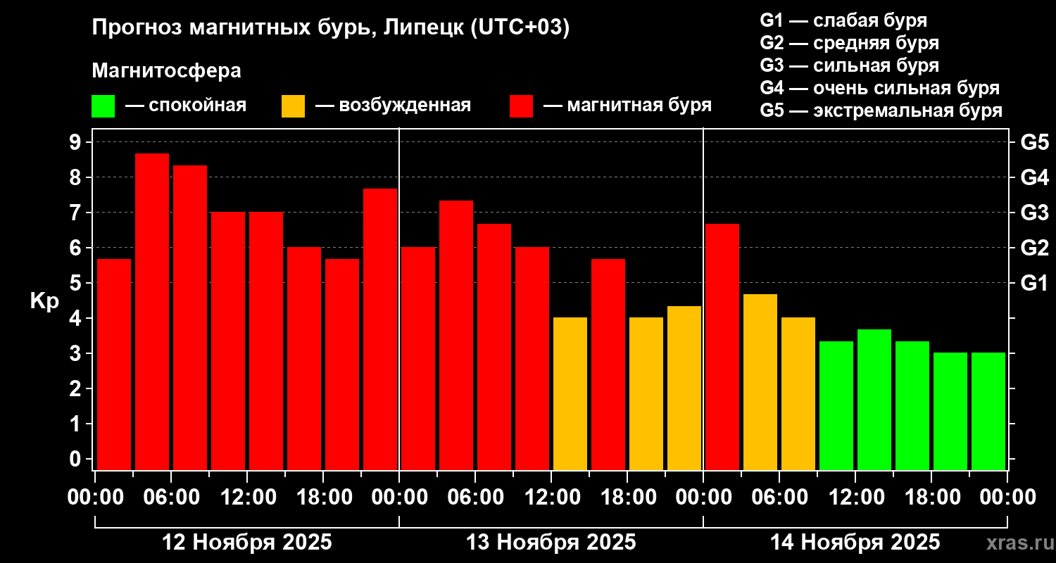 Прогноз магнитных бурь в Липецке — 12 ноября 2025 года