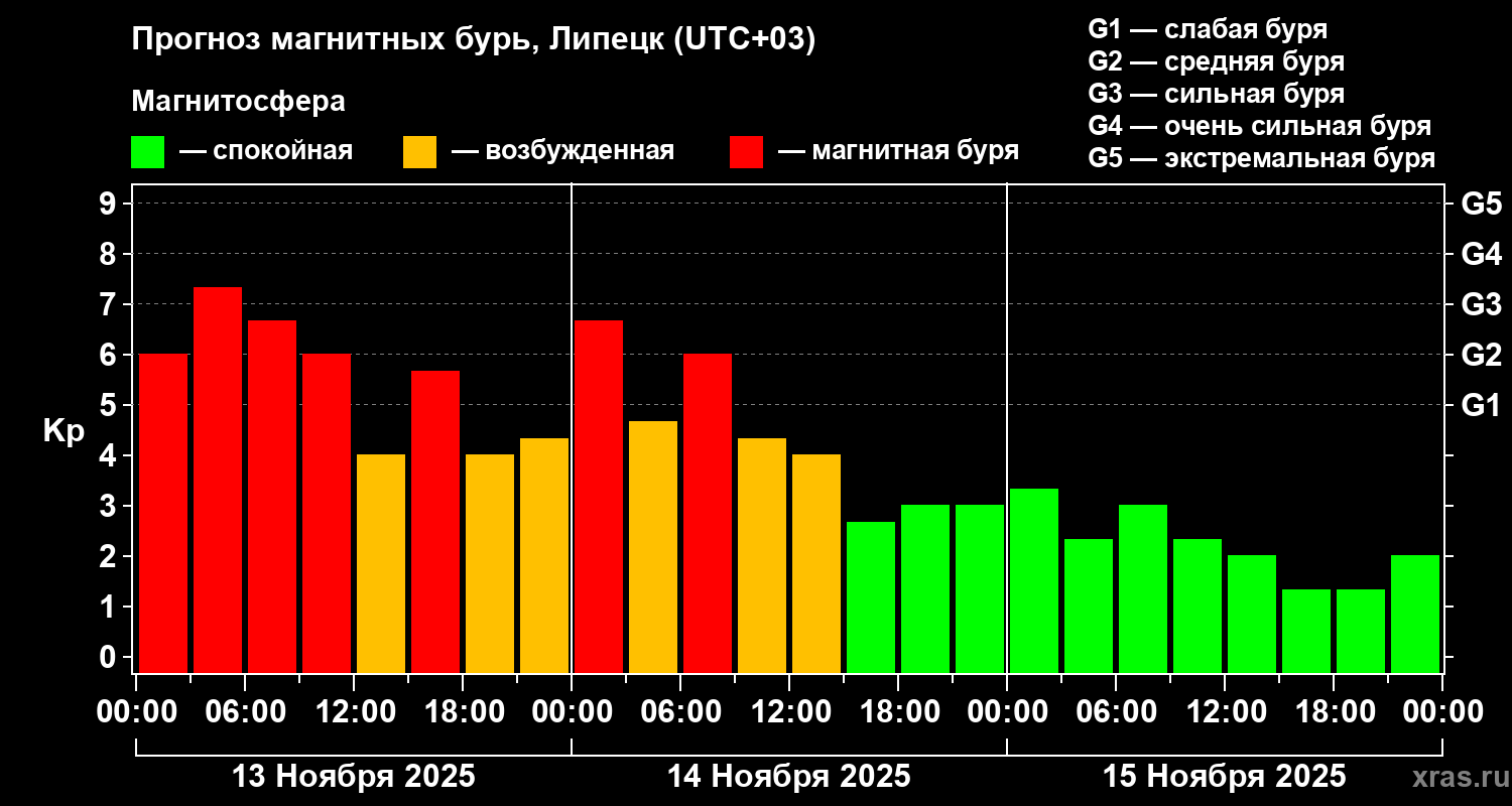 Прогноз магнитных бурь в Липецке на 13 ноября 2025 года