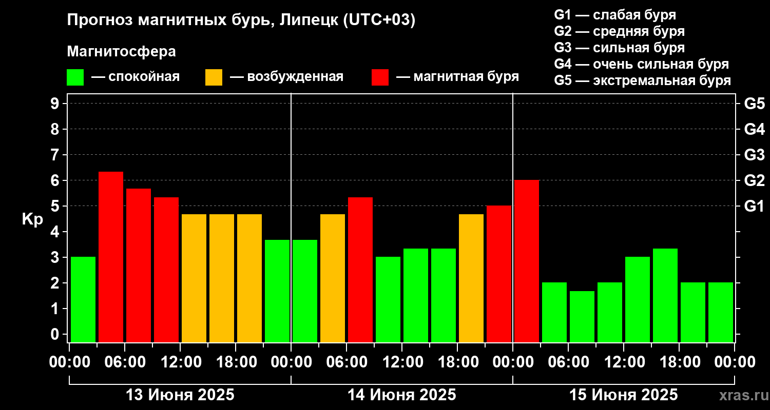 Прогноз магнитных бурь в Липецке на 13 июня 2025 года