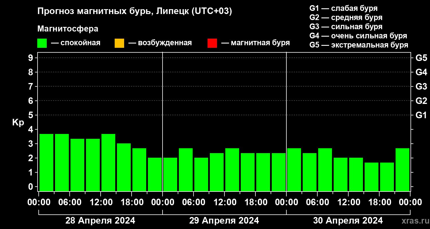 Прогноз магнитных бурь в Липецке на 28 апреля 2024 года