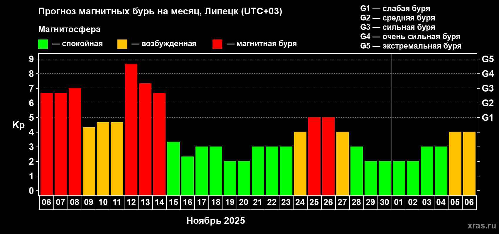 Прогноз магнитных бурь в Липецке — 6 ноября 2025 года