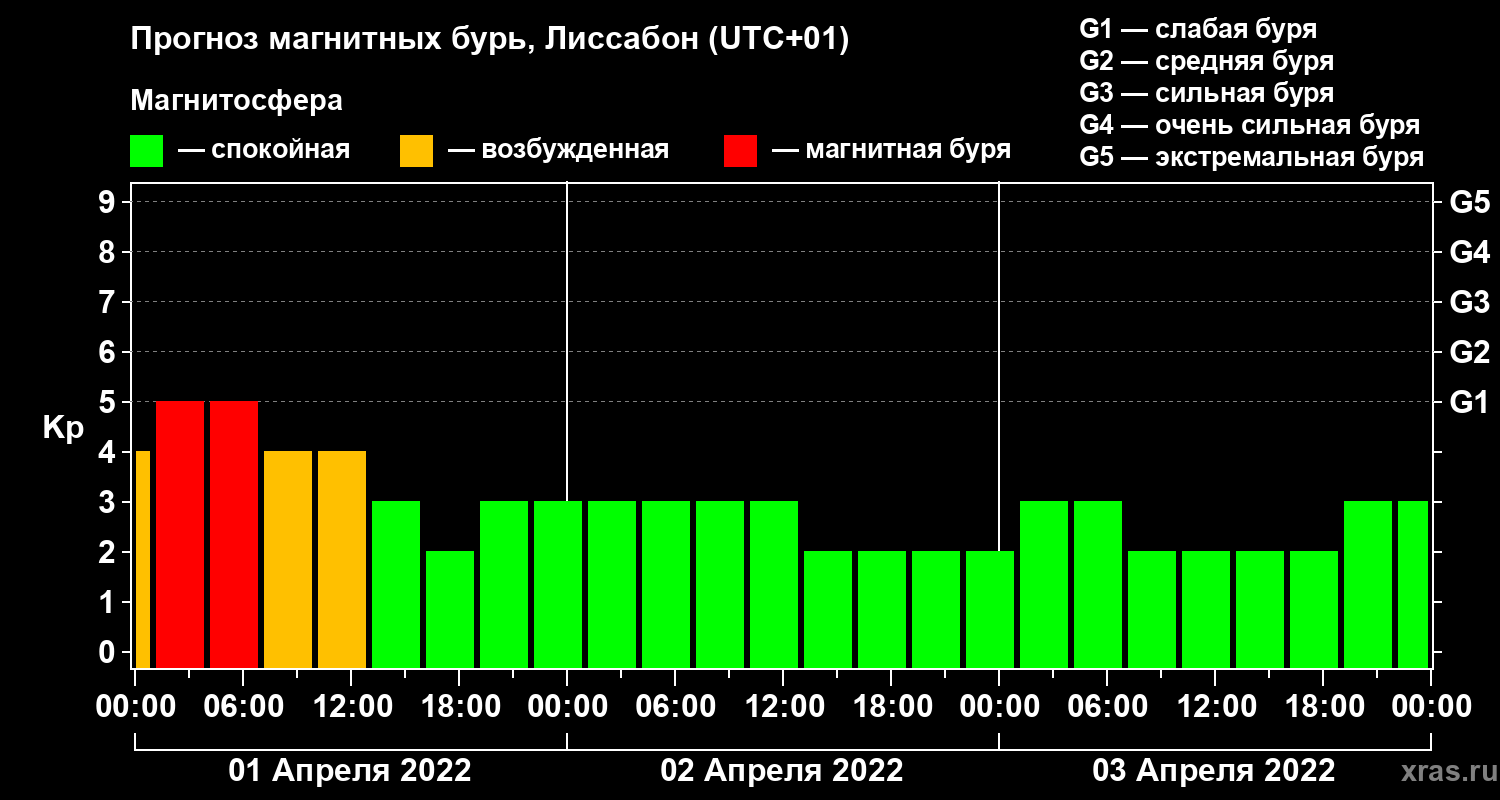 Прогноз магнитных бурь в Лиссабоне на 1 апреля 2022 года
